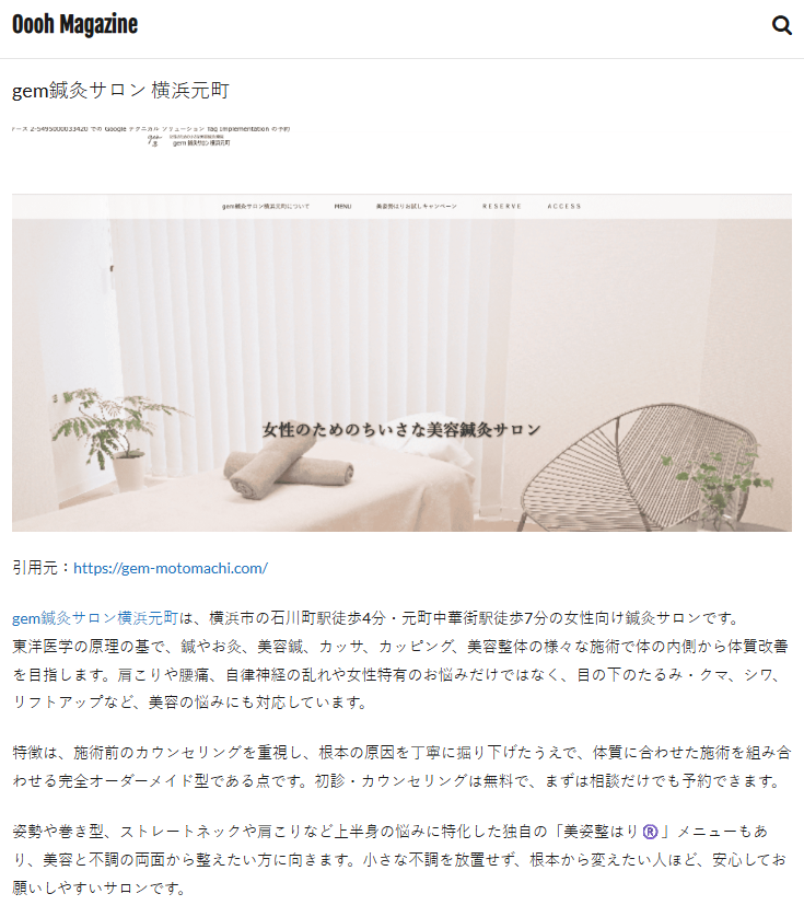 このたび、リゾート婚やフォトブライダルなど特別な日のサービスを紹介するWebメディア「Oooh Magazine」(Oooh株式会社運営)内の記事「【旅行も楽しむ結婚式】リゾート婚・フォトウェディングにおすすめのブライダルサービスまとめ」にgem鍼灸サロン横浜元町をご紹介いただきました。